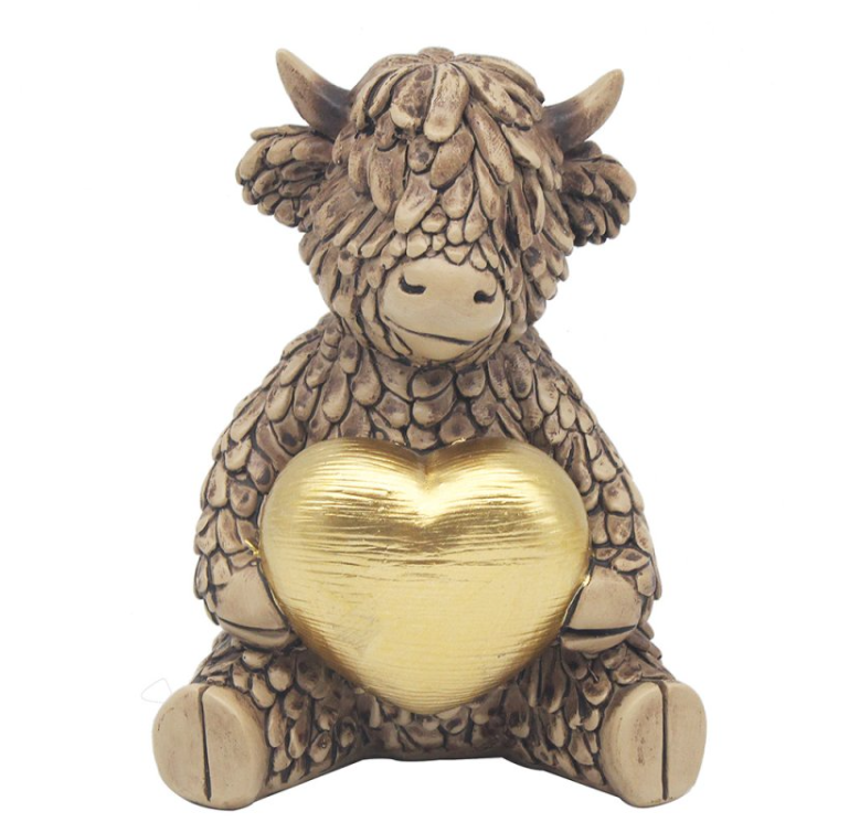 Dimensions (cm): 8x6x11 Little Highland Cow with a gold heart, makes lovely home decor.